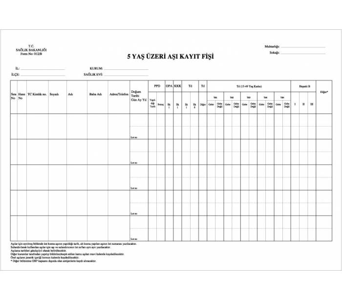 - 5 yaş üzeri tüm bireylerin aşılamalarının takibi ve arşivlenebilmesi için kullanılan defter